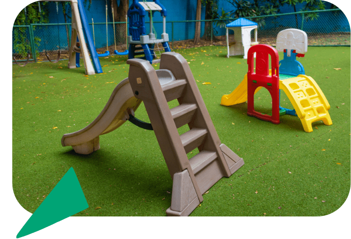 Diversión extensa que incluye equipos para columpiarse, escalar, deslizarse, entre otras destrezas motrices. También cuenta con casitas y arquerías/cestas y pelotas diversas. Siempre buscamos el contacto con la naturaleza (plantas y animales) y el desarrollo de la motricidad gruesa.